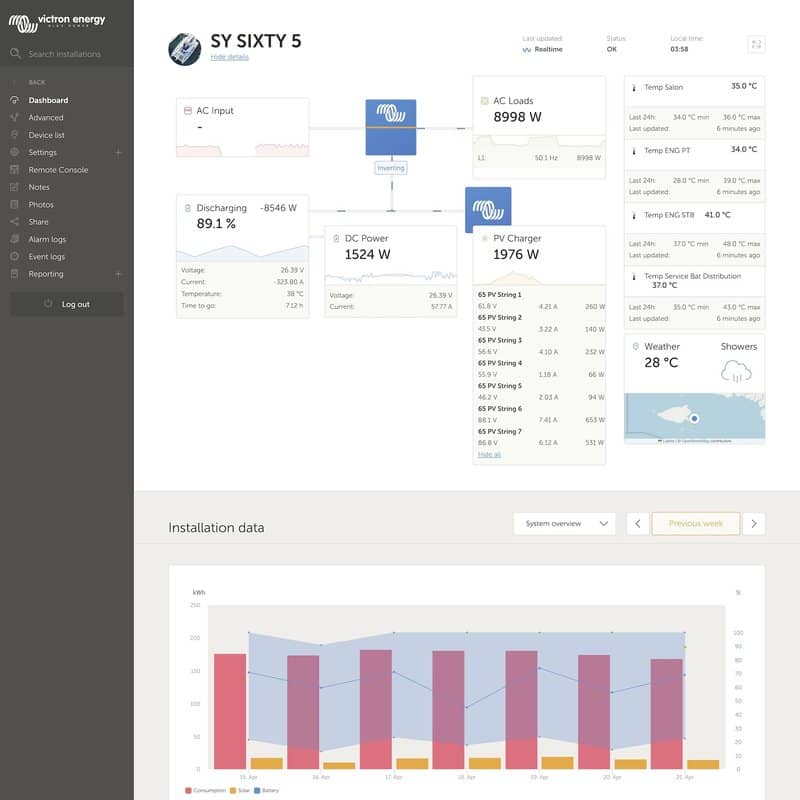 All data collected from the components – including tank and temperature sensors – is gathered by the Cerbo GX, which not only displays it graphically on a GX Touch 70 but also the Raymarine chart plotter: It connects to the Victron Remote Management portal – VRM – via the Internet. The owner can monitor their system using this free platform to access all data and receive alarms if there is a problem on board. Furthermore, our technicians can access the system via the portal and, if necessary, install updates, change configurations or view data records.