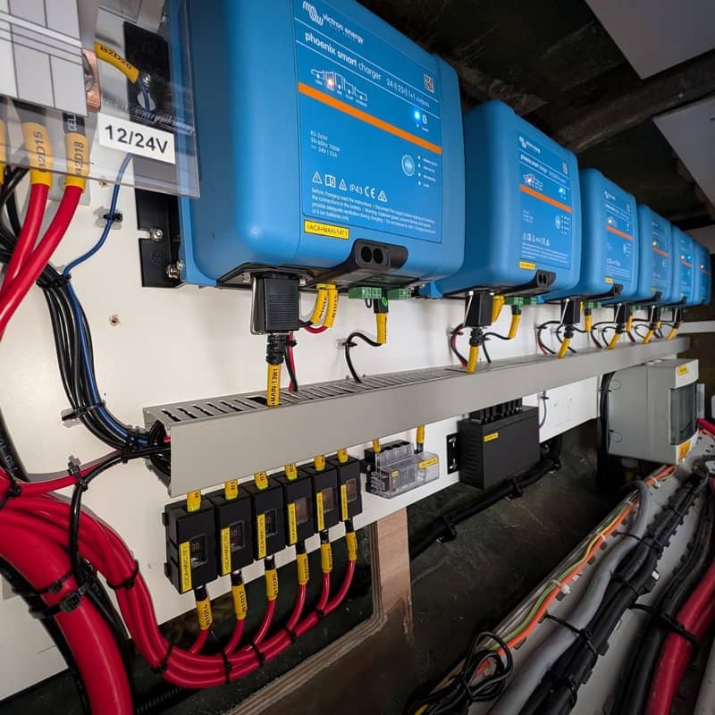 The SmartSolar MPPT charge controllers are networked with a VE Smart Network via Bluetooth and also communicate with each other via VE.Direct connections using the Cerbo GX. This networking allows synchronised charging and can also compensate for any voltage drop on the cable to the battery, which prevents the solar controllers from influencing each other. As we use far more VE.Direct connections than the Cerbo can accept they are connected to powered USB hubs via VE.Direct USB interfaces.