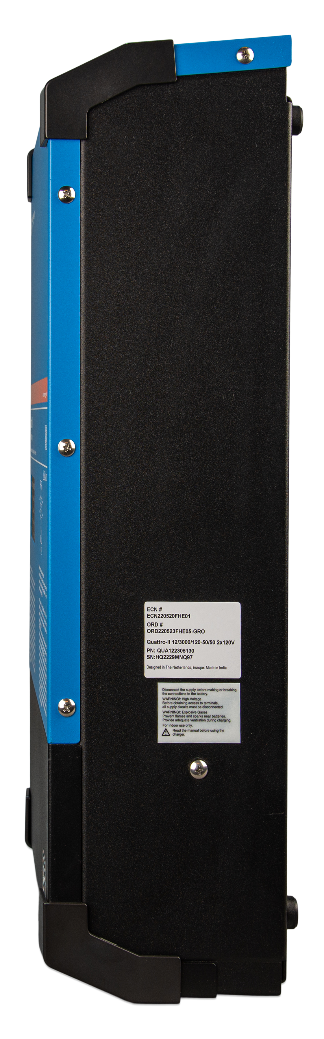 The Quattro-II 2x 120V has all of the expected features of our versatile inverter/charger range, including PowerControl, PowerAssist, Input Current Limit, two AC outputs, as well as parallel and 3-phase configuration for larger capacity VE.Bus systems. Suitable for LiFePO4 batteries and a variety of other battery technologies.
